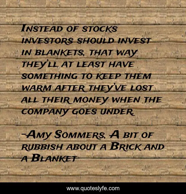 This page presents the quote "Instead of stocks investors should invest in blankets, that way they’ll at least have something to keep them warm after they’ve lost all their money when the company goes under.". Author of this quote is Amy Sommers, A bit of rubbish about a Brick and a Blanket. This quote is about funny, stocks, humor, finance, investors, brick-and-blanket-iq-test, random, brick-and-blanket-test, comedy,.