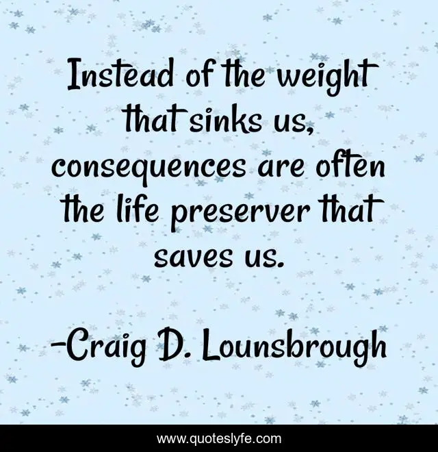 This page presents the quote "Instead of the weight that sinks us, consequences are often the life preserver that saves us.". Author of this quote is Craig D. Lounsbrough. This quote is about lessons, sinking, perishing, perish, consequences, redeemed, salvation, weight, redeem,.