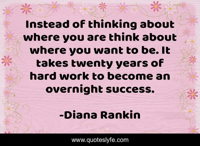 This page presents the quote "Instead of thinking about where you are think about where you want to be. It takes twenty years of hard work to become an overnight success.". Author of this quote is Diana Rankin. .