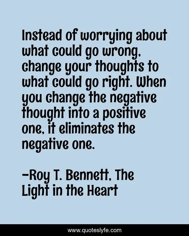 This page presents the quote "Instead of worrying about what could go wrong, change your thoughts to what could go right. When you change the negative thought into a positive one, it eliminates the negative one.". Author of this quote is Roy T. Bennett, The Light in the Heart. This quote is about living, inspiring, inspire, positive, positive-affirmation, motivational, life, confidence, optimism,.