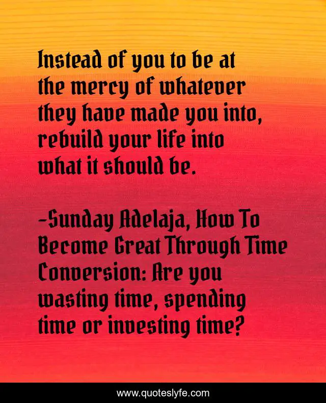 This page presents the quote "Instead of you to be at the mercy of whatever they have made you into, rebuild your life into what it should be.". Author of this quote is Sunday Adelaja, How To Become Great Through Time Conversion: Are you wasting time, spending time or investing time?. This quote is about mercy, conversion, productivity, wealth, gift, great, work, life, convert,.