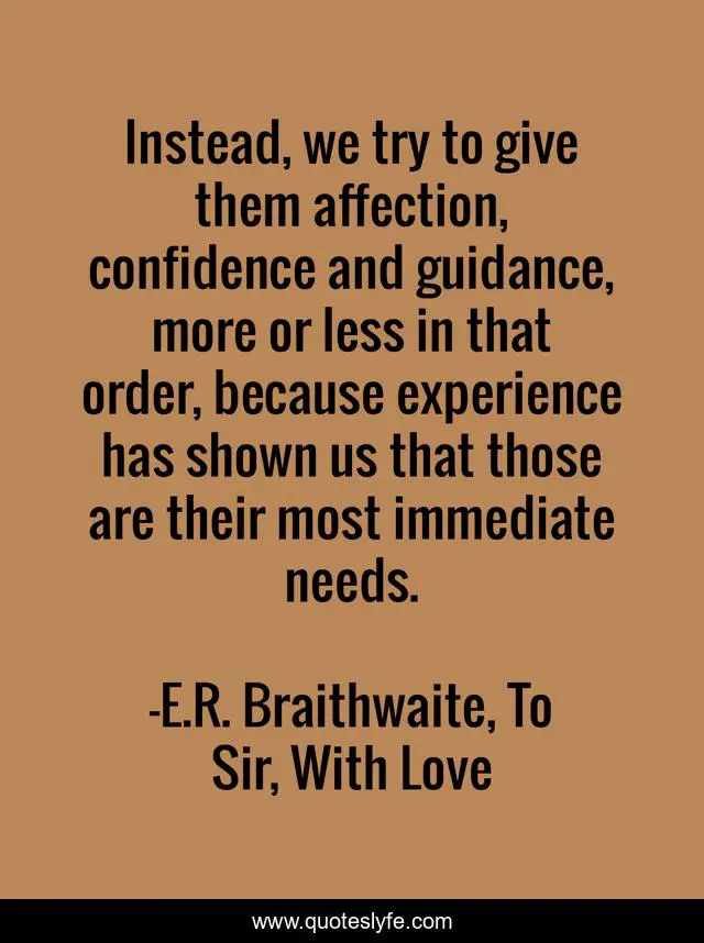 This page presents the quote "Instead, we try to give them affection, confidence and guidance, more or less in that order, because experience has shown us that those are their most immediate needs.". Author of this quote is E.R. Braithwaite, To Sir, With Love. .
