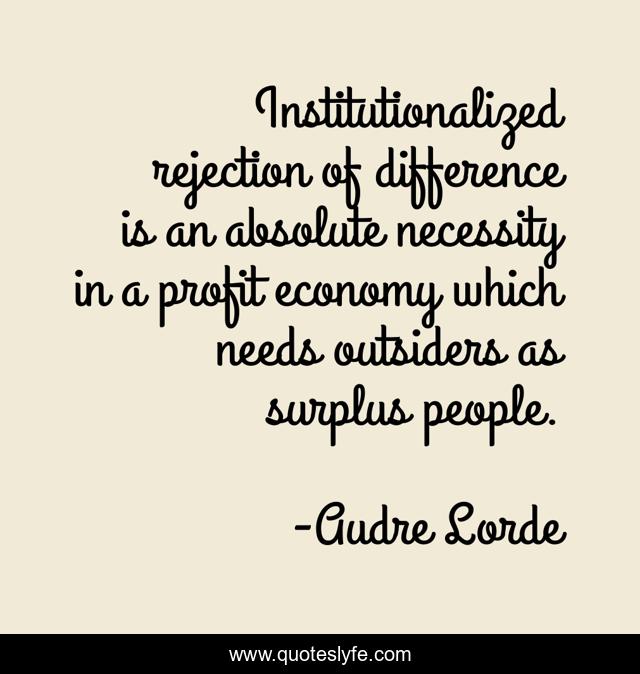 This page presents the quote "Institutionalized rejection of difference is an absolute necessity in a profit economy which needs outsiders as surplus people.". Author of this quote is Audre Lorde. This quote is about different, rejection, surplus, profit, discrimination, economics-society, differences, institutionalized, misfits,.
