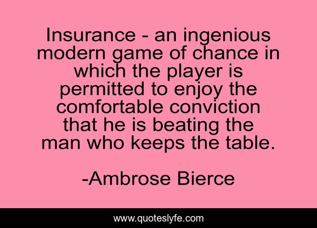 This page presents the quote "Insurance - an ingenious modern game of chance in which the player is permitted to enjoy the comfortable conviction that he is beating the man who keeps the table.". Author of this quote is Ambrose Bierce. This quote is about enjoy, game, man,.
