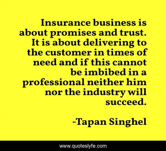This page presents the quote "Insurance business is about promises and trust. It is about delivering to the customer in times of need and if this cannot be imbibed in a professional neither him nor the industry will succeed.". Author of this quote is Tapan Singhel. This quote is about professionalism, trust, promise, insurance, customer-service,.
