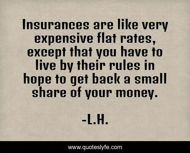 This page presents the quote "Insurances are like very expensive flat rates, except that you have to live by their rules in hope to get back a small share of your money.". Author of this quote is L.H.. This quote is about scam, flat-rate, joke, insurance-law, safety, money, politics, law, insurances,.