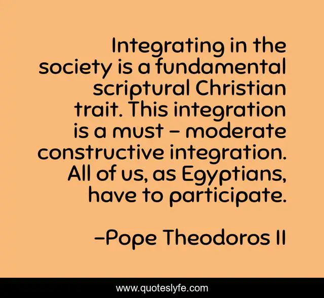 This page presents the quote "Integrating in the society is a fundamental scriptural Christian trait. This integration is a must - moderate constructive integration. All of us, as Egyptians, have to participate.". Author of this quote is Pope Theodoros II. This quote is about christian, integration,.