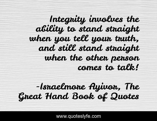 This page presents the quote "Integrity involves the ability to stand straight when you tell your truth, and still stand straight when the other person comes to talk!". Author of this quote is Israelmore Ayivor, The Great Hand Book of Quotes. This quote is about tell-the-truth, food-for-thought, stand-still, honesty, truthfulness, justice, truthful, sincere, talk-truthfully,.