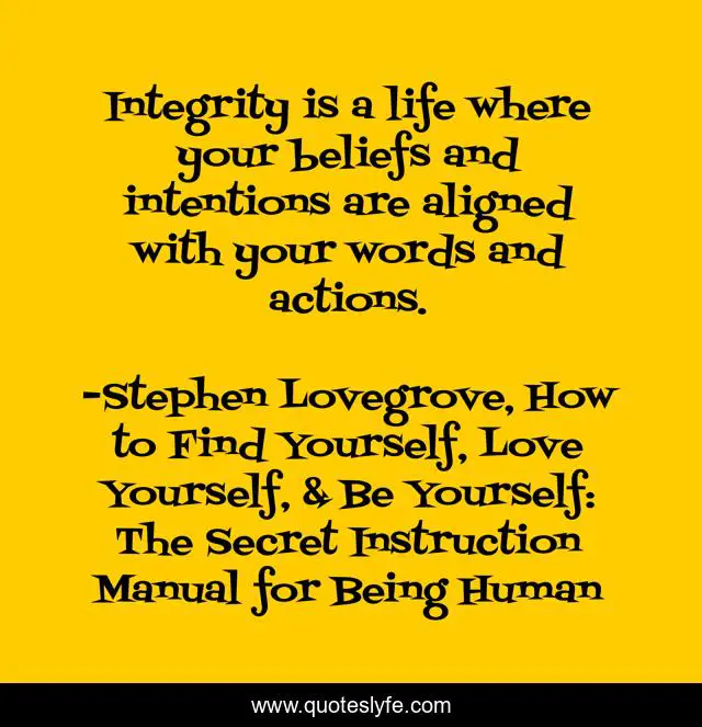 This page presents the quote "Integrity is a life where your beliefs and intentions are aligned with your words and actions.". Author of this quote is Stephen Lovegrove, How to Find Yourself, Love Yourself, & Be Yourself: The Secret Instruction Manual for Being Human. This quote is about actions, beliefs, intentions, words, self-help, integrity, personal-growth-personal,.