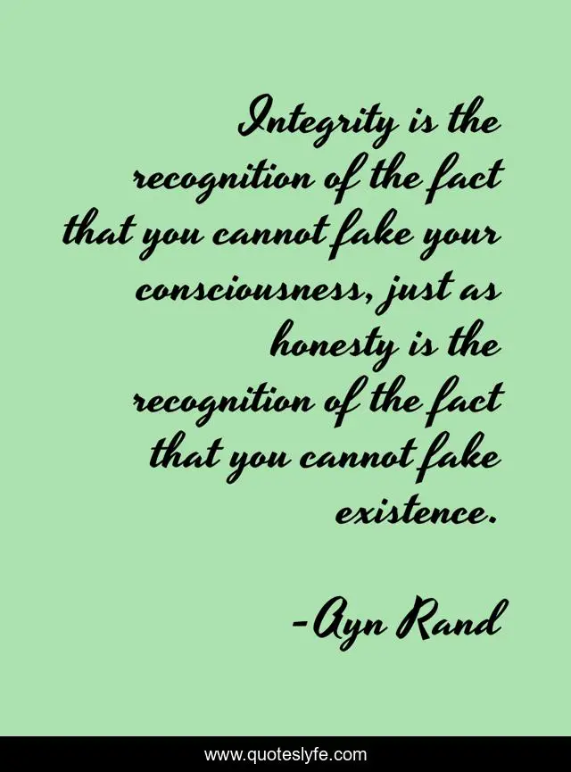 This page presents the quote "Integrity is the recognition of the fact that you cannot fake your consciousness, just as honesty is the recognition of the fact that you cannot fake existence.". Author of this quote is Ayn Rand. This quote is about existence, integrity, honesty, consciousness,.