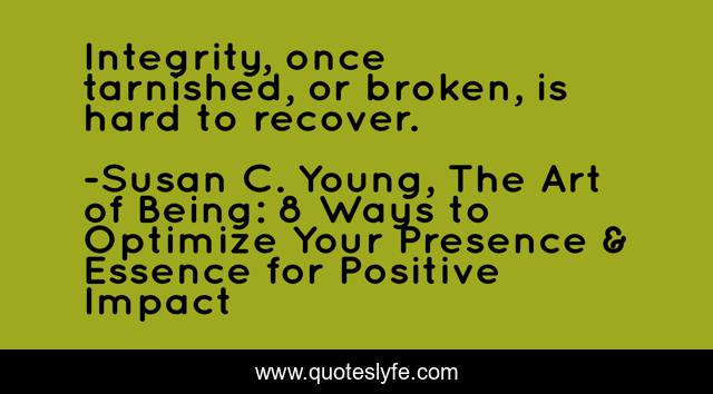 "Susan C. Young, The Art of Being: 8 Ways to Optimize Your Presence & Essence for Positive Impact Quotes." Quoteslyfe.com, 2025. Fri. 05 Dec. 2025. <https://www.quoteslyfe.com/quote/Integrity-once-tarnished-or-broken-is-hard-119246>.