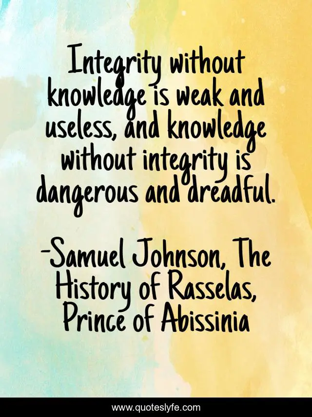 This page presents the quote "Integrity without knowledge is weak and useless, and knowledge without integrity is dangerous and dreadful.". Author of this quote is Samuel Johnson, The History of Rasselas, Prince of Abissinia. This quote is about integrity, knowledge,.