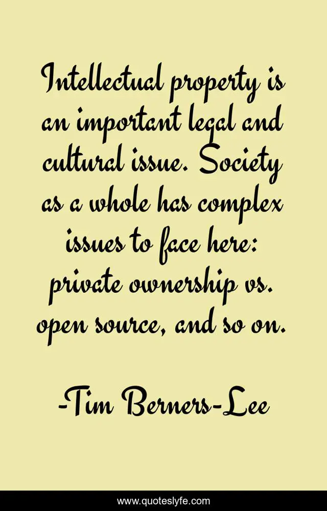 This page presents the quote "Intellectual property is an important legal and cultural issue. Society as a whole has complex issues to face here: private ownership vs. open source, and so on.". Author of this quote is Tim Berners-Lee. This quote is about legal, intellectual, face,.