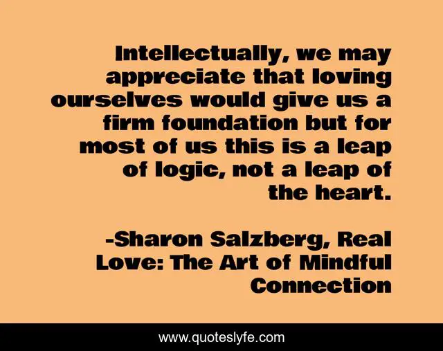 This page presents the quote "Intellectually, we may appreciate that loving ourselves would give us a firm foundation but for most of us this is a leap of logic, not a leap of the heart.". Author of this quote is Sharon Salzberg, Real Love: The Art of Mindful Connection. This quote is about confidence, love, positive, motivational, optimistic, affection,.