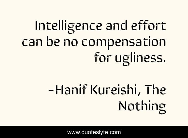 This page presents the quote "Intelligence and effort can be no compensation for ugliness.". Author of this quote is Hanif Kureishi, The Nothing. This quote is about ugliness, intelligence,.