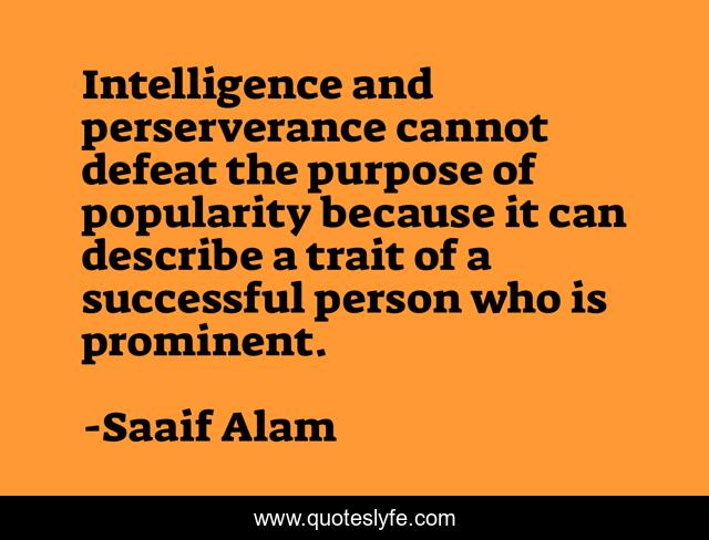 This page presents the quote "Intelligence and perserverance cannot defeat the purpose of popularity because it can describe a trait of a successful person who is prominent.". Author of this quote is Saaif Alam. This quote is about poltics, ethics, education, morality,.