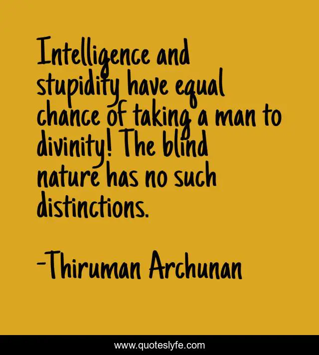 This page presents the quote "Intelligence and stupidity have equal chance of taking a man to divinity! The blind nature has no such distinctions.". Author of this quote is Thiruman Archunan. This quote is about intelligence, stupidity, divine, divinity,.