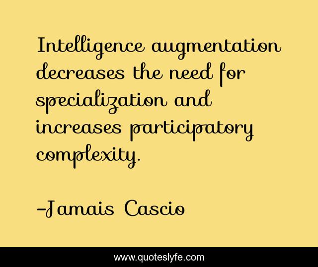 This page presents the quote "Intelligence augmentation decreases the need for specialization and increases participatory complexity.". Author of this quote is Jamais Cascio. This quote is about need, complexity, increases,.