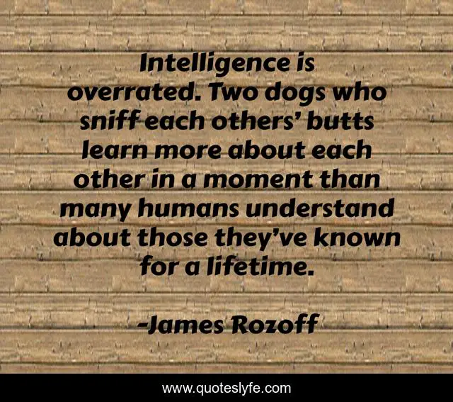 This page presents the quote "Intelligence is overrated. Two dogs who sniff each others’ butts learn more about each other in a moment than many humans understand about those they’ve known for a lifetime.". Author of this quote is James Rozoff. This quote is about intelligence, dogs, intellect,.