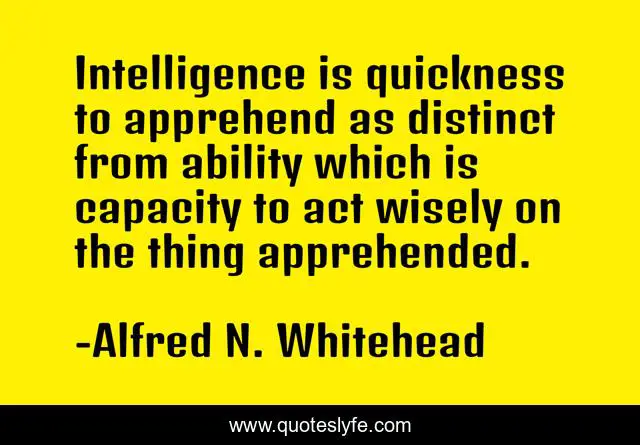This page presents the quote "Intelligence is quickness to apprehend as distinct from ability which is capacity to act wisely on the thing apprehended.". Author of this quote is Alfred N. Whitehead. .