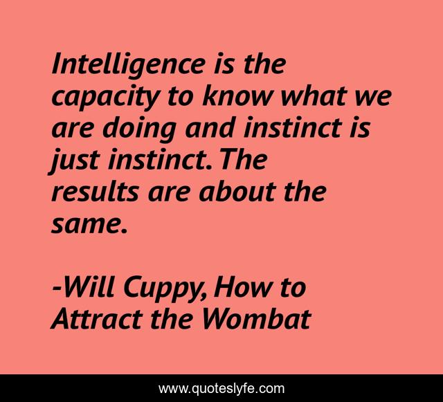 This page presents the quote "Intelligence is the capacity to know what we are doing and instinct is just instinct. The results are about the same.". Author of this quote is Will Cuppy, How to Attract the Wombat. This quote is about animals, humor, consciousness, intelligence,.