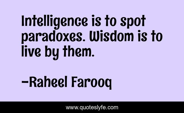 "Raheel Farooq Quotes." Quoteslyfe.com, 2025. Sat. 06 Dec. 2025. <https://www.quoteslyfe.com/quote/Intelligence-is-to-spot-paradoxes-Wisdom-is-228966>.