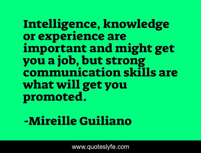 This page presents the quote "Intelligence, knowledge or experience are important and might get you a job, but strong communication skills are what will get you promoted.". Author of this quote is Mireille Guiliano. This quote is about knowledge, experience,.