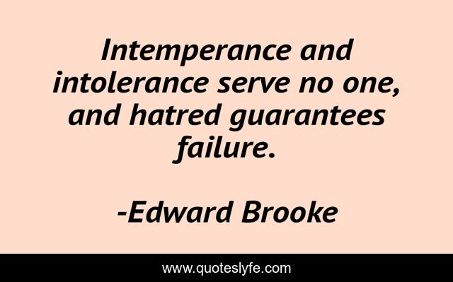This page presents the quote "Intemperance and intolerance serve no one, and hatred guarantees failure.". Author of this quote is Edward Brooke. This quote is about intolerance, hatred, serve,.