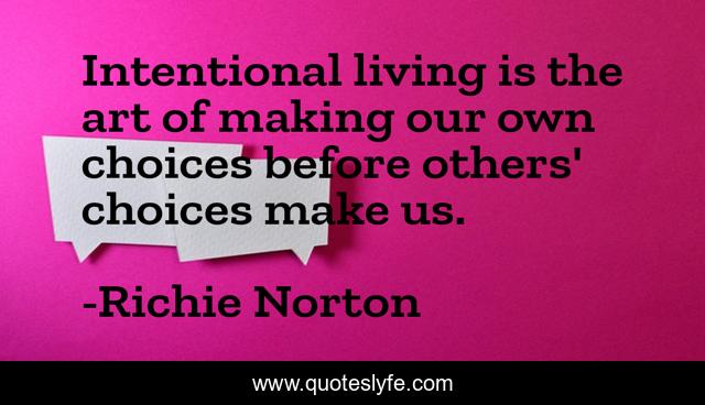 This page presents the quote "Intentional living is the art of making our own choices before others' choices make us.". Author of this quote is Richie Norton. This quote is about art, living-with-intent, choices, free-agency, intent, living-life-in-the-present, living-life-to-the-fullest, choice, intentional,.
