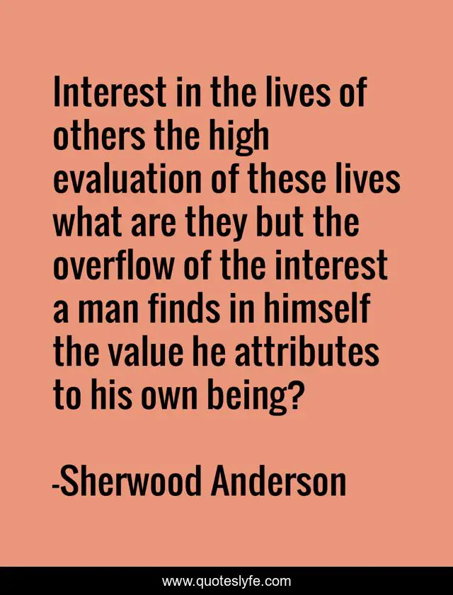 This page presents the quote "Interest in the lives of others the high evaluation of these lives what are they but the overflow of the interest a man finds in himself the value he attributes to his own being?". Author of this quote is Sherwood Anderson. This quote is about self, acceptance,.