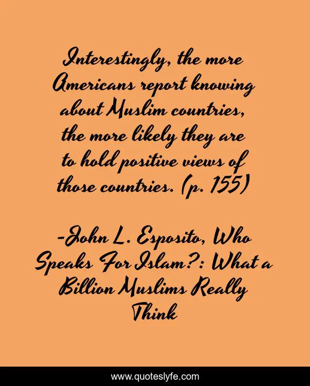 This page presents the quote "Interestingly, the more Americans report knowing about Muslim countries, the more likely they are to hold positive views of those countries. (p. 155)". Author of this quote is John L. Esposito, Who Speaks For Islam?: What a Billion Muslims Really Think. This quote is about united-states, islam,.