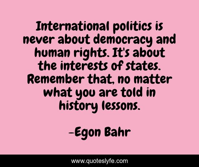 This page presents the quote "International politics is never about democracy and human rights. It's about the interests of states. Remember that, no matter what you are told in history lessons.". Author of this quote is Egon Bahr. This quote is about politics, geopolitics, foreign-policy, democracy, realpolitik,.
