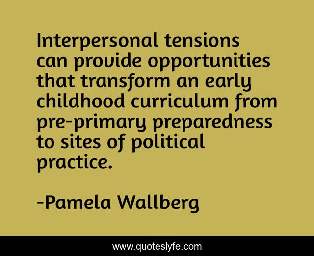 This page presents the quote "Interpersonal tensions can provide opportunities that transform an early childhood curriculum from pre-primary preparedness to sites of political practice.". Author of this quote is Pamela Wallberg. This quote is about early-childhood, curriculum, political, learning, transformative,.
