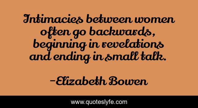 This page presents the quote "Intimacies between women often go backwards, beginning in revelations and ending in small talk.". Author of this quote is Elizabeth Bowen. This quote is about small, beginning, ending,.
