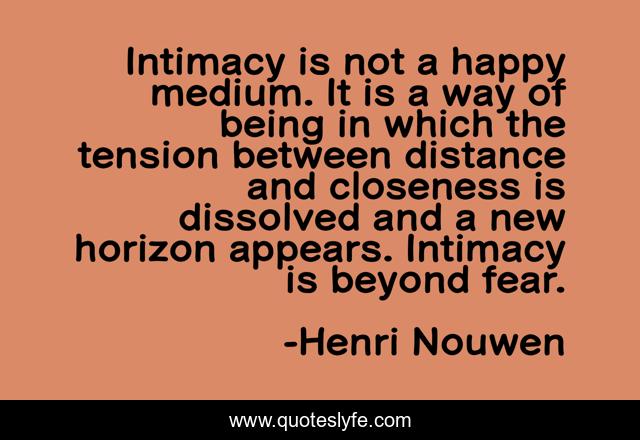 This page presents the quote "Intimacy is not a happy medium. It is a way of being in which the tension between distance and closeness is dissolved and a new horizon appears. Intimacy is beyond fear.". Author of this quote is Henri Nouwen. This quote is about distance, horizon, happy,.
