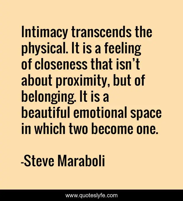 This page presents the quote "Intimacy transcends the physical. It is a feeling of closeness that isn’t about proximity, but of belonging. It is a beautiful emotional space in which two become one.". Author of this quote is Steve Maraboli. This quote is about relationships, true-love, belonging, love, intimacy, affection,.