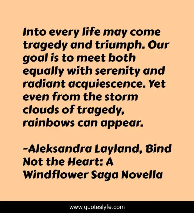This page presents the quote "Into every life may come tragedy and triumph. Our goal is to meet both equally with serenity and radiant acquiescence. Yet even from the storm clouds of tragedy, rainbows can appear.". Author of this quote is Aleksandra Layland, Bind Not the Heart: A Windflower Saga Novella. This quote is about tragedy-of-life, serenity-of-the-mind, serenity, life-lessons, acquiescence, life-philosophy, tragedy, triumph,.