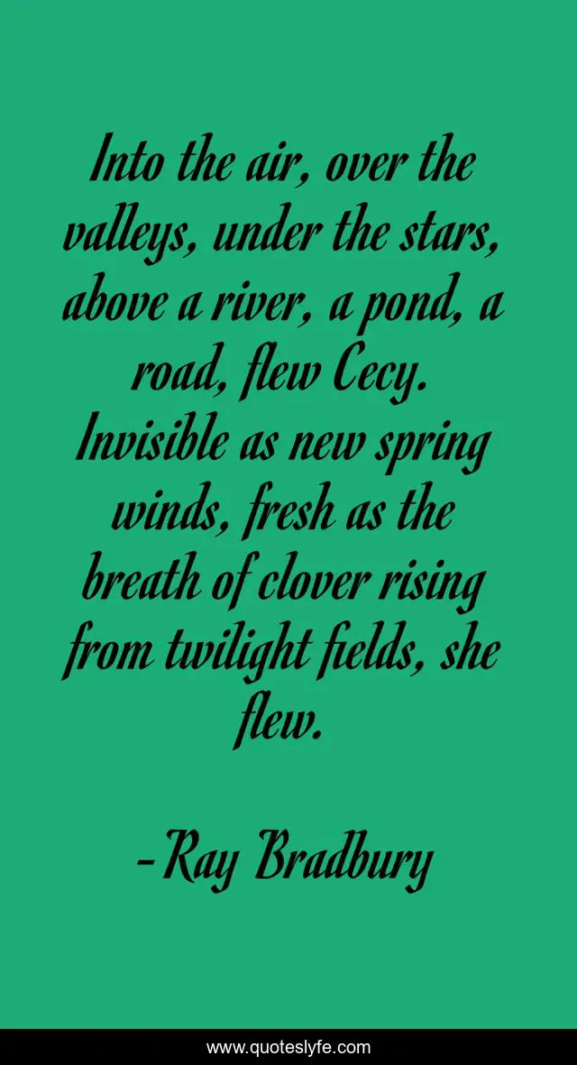 This page presents the quote "Into the air, over the valleys, under the stars, above a river, a pond, a road, flew Cecy. Invisible as new spring winds, fresh as the breath of clover rising from twilight fields, she flew.". Author of this quote is Ray Bradbury. This quote is about fantasy, witches,.