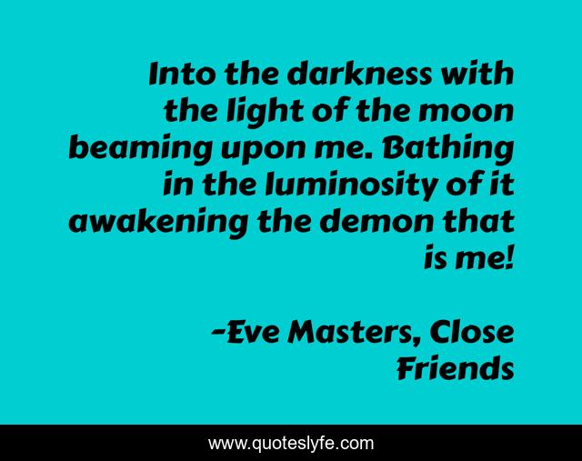 This page presents the quote "Into the darkness with the light of the moon beaming upon me. Bathing in the luminosity of it awakening the demon that is me!". Author of this quote is Eve Masters, Close Friends. This quote is about darkness, immortality, vampires, sci-fi, dark-fantasy,.