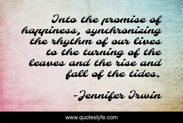 This page presents the quote "Into the promise of happiness, synchronizing the rhythm of our lives to the turning of the leaves and the rise and fall of the tides.". Author of this quote is Jennifer Irwin. This quote is about beauty, happiness, peaceful,.