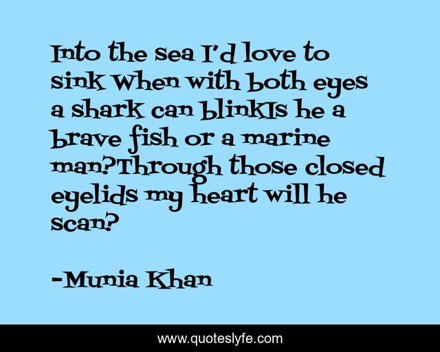 This page presents the quote "Into the sea I’d love to sink When with both eyes a shark can blinkIs he a brave fish or a marine man?Through those closed eyelids my heart will he scan?". Author of this quote is Munia Khan. This quote is about love-for-shark, heart, eyes, brave, closed, oceanic, fish, scan, shark,.