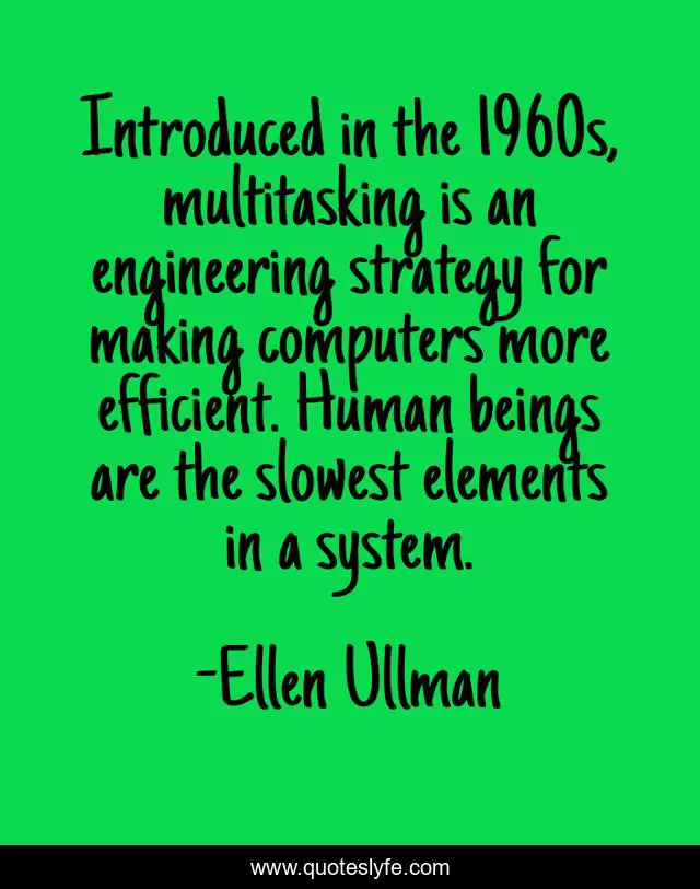 This page presents the quote "Introduced in the 1960s, multitasking is an engineering strategy for making computers more efficient. Human beings are the slowest elements in a system.". Author of this quote is Ellen Ullman. This quote is about engineering, human, strategy,.