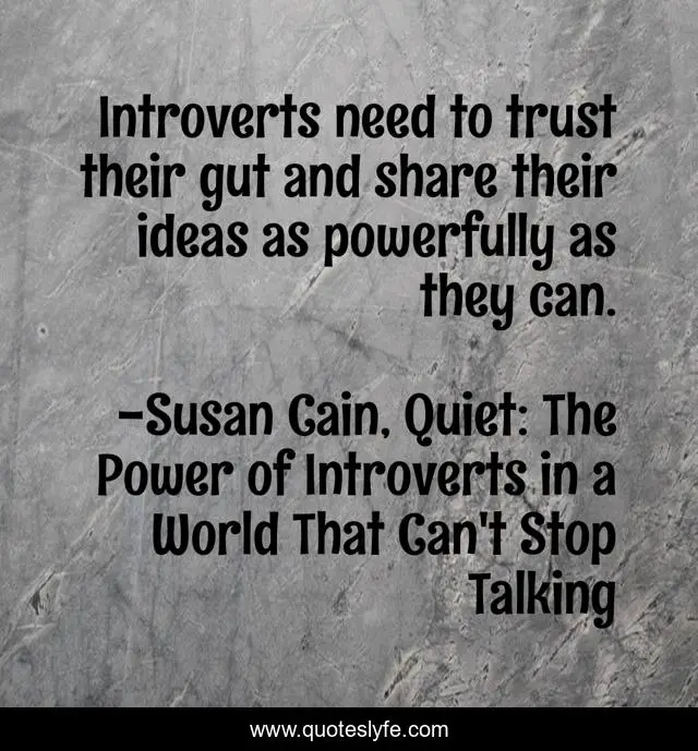 This page presents the quote "Introverts need to trust their gut and share their ideas as powerfully as they can.". Author of this quote is Susan Cain, Quiet: The Power of Introverts in a World That Can't Stop Talking. This quote is about trust, introverts, ideas,.