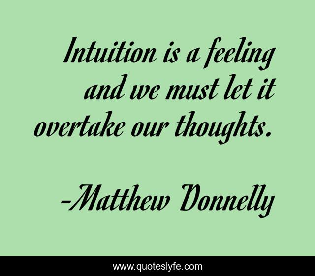 This page presents the quote "Intuition is a feeling and we must let it overtake our thoughts.". Author of this quote is Matthew Donnelly. This quote is about intuition, motivation, inspiration,.