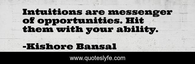 This page presents the quote "Intuitions are messenger of opportunities. Hit them with your ability.". Author of this quote is Kishore Bansal. This quote is about intuition, opportunity, ability, messengers,.