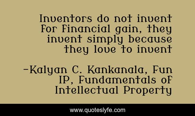 This page presents the quote "Inventors do not invent for financial gain, they invent simply because they love to invent". Author of this quote is Kalyan C. Kankanala, Fun IP, Fundamentals of Intellectual Property. This quote is about intellectual-property, india, invent, patents, inventors,.