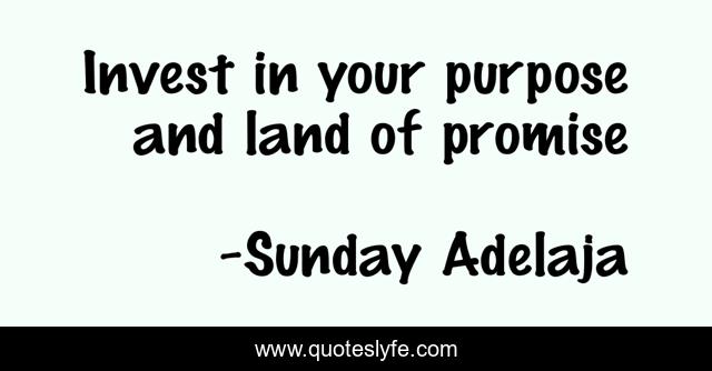 This page presents the quote "Invest in your purpose and land of promise". Author of this quote is Sunday Adelaja. This quote is about love, pragmatic, people, money, principles, selflessness, employment, worship, impact,.