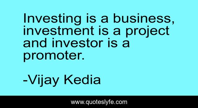 This page presents the quote "Investing is a business, investment is a project and investor is a promoter.". Author of this quote is Vijay Kedia. This quote is about business-success, stock-market, business, business-leaders,.