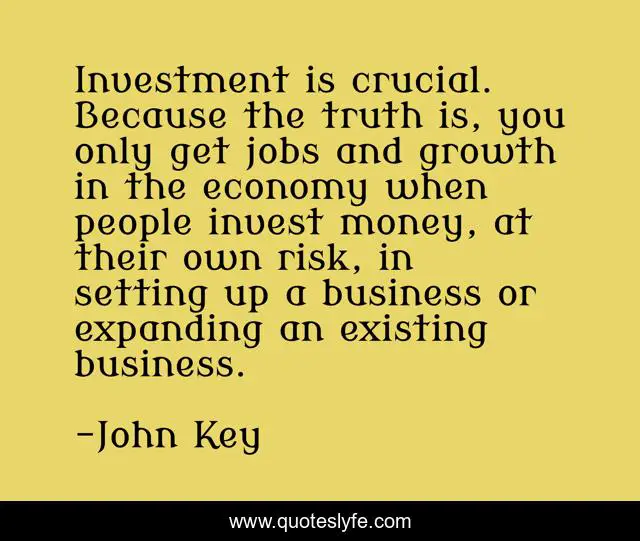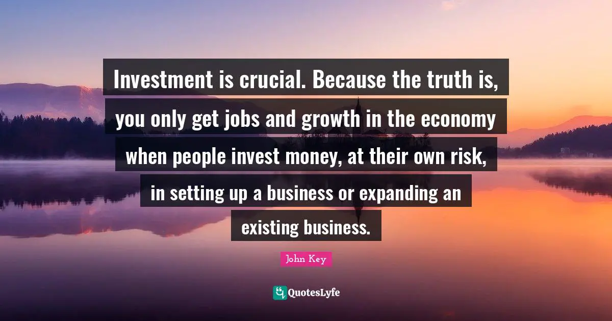 This page presents the quote "Investment is crucial. Because the truth is, you only get jobs and growth in the economy when people invest money, at their own risk, in setting up a business or expanding an existing business.". Author of this quote is John Key. This quote is about money, growth, truth,.
