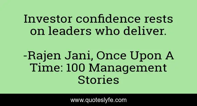 This page presents the quote "Investor confidence rests on leaders who deliver.". Author of this quote is Rajen Jani, Once Upon A Time: 100 Management Stories. This quote is about motivation, communication, sales, anger, improvement, quality, management, knowledge, strategy,.